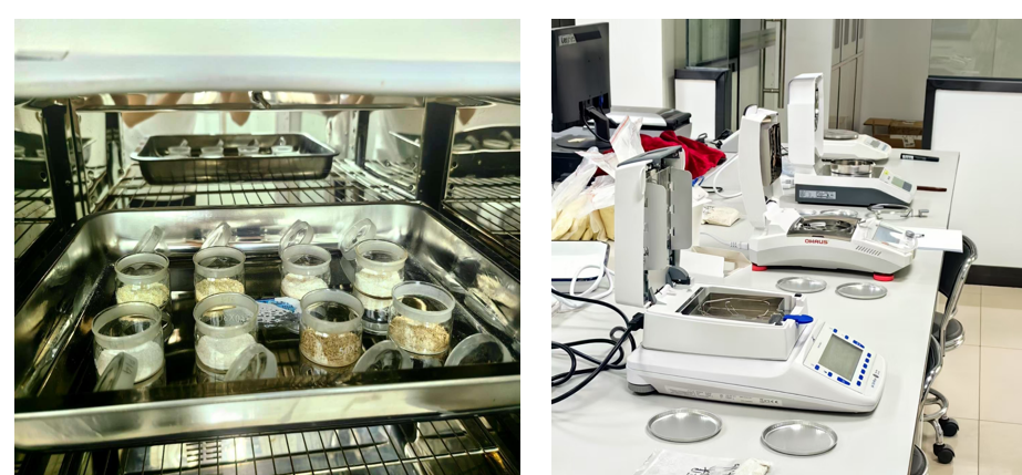 左图为烘箱干燥法,右图为卤素快速干燥法,图片上是稻谷、小麦、玉米和大米的多型号仪器参数验证测试。