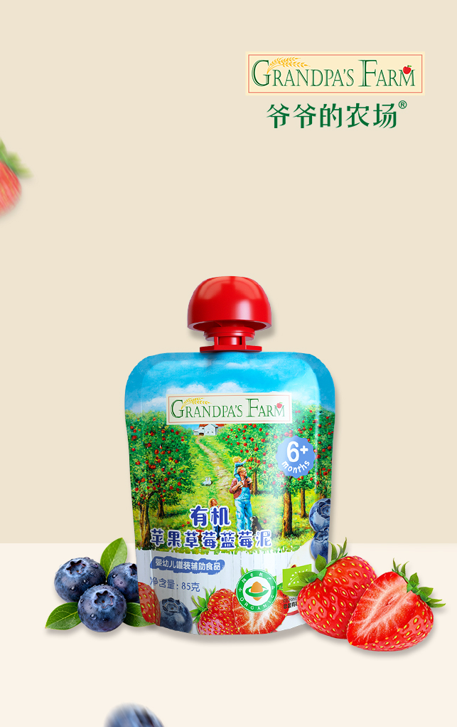 爷爷的农场有机苹果草莓蓝莓泥,法国原装进口,获得中欧双重有机认证,符合婴幼儿辅食标准,品质保障;果泥口感细腻,易吞咽,好吸收,100%鲜果泥,适合婴幼儿食用;产品以苹果、草莓、蓝莓的科学配比,富含抗氧化剂、膳食纤维及多种维生素矿物质,满足其日常膳食营养均衡需求。为6个月以上处于辅食添加阶段的宝宝,提供安全、营养丰富的初期辅食;独立小包装设计方便携带,包装四层锁鲜,果泥不易氧化变质,契合现代家庭外出喂养场景需求。此外,针对健身人士、老年人等特殊群体,突出产品易消化、低热量且能快速补充维生素与能量的优势,精准满足其营养补充与健康养生需求。