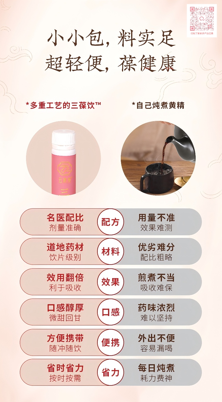 云教授®三葆饮精杞植物饮料源于广东省中医院知名妇科中医40余年的自用珍藏名方。经过两年多的反复调整、测试以及百余名志愿者朋友的试用反馈,同时得到了世界500强广药集团白云山星群药业的认可,突破了传统煎煮不便、成分吸收率低的弊端,谨遵制药的工艺,共同研发出适用人群广、服用简便、安全高效的佳品。