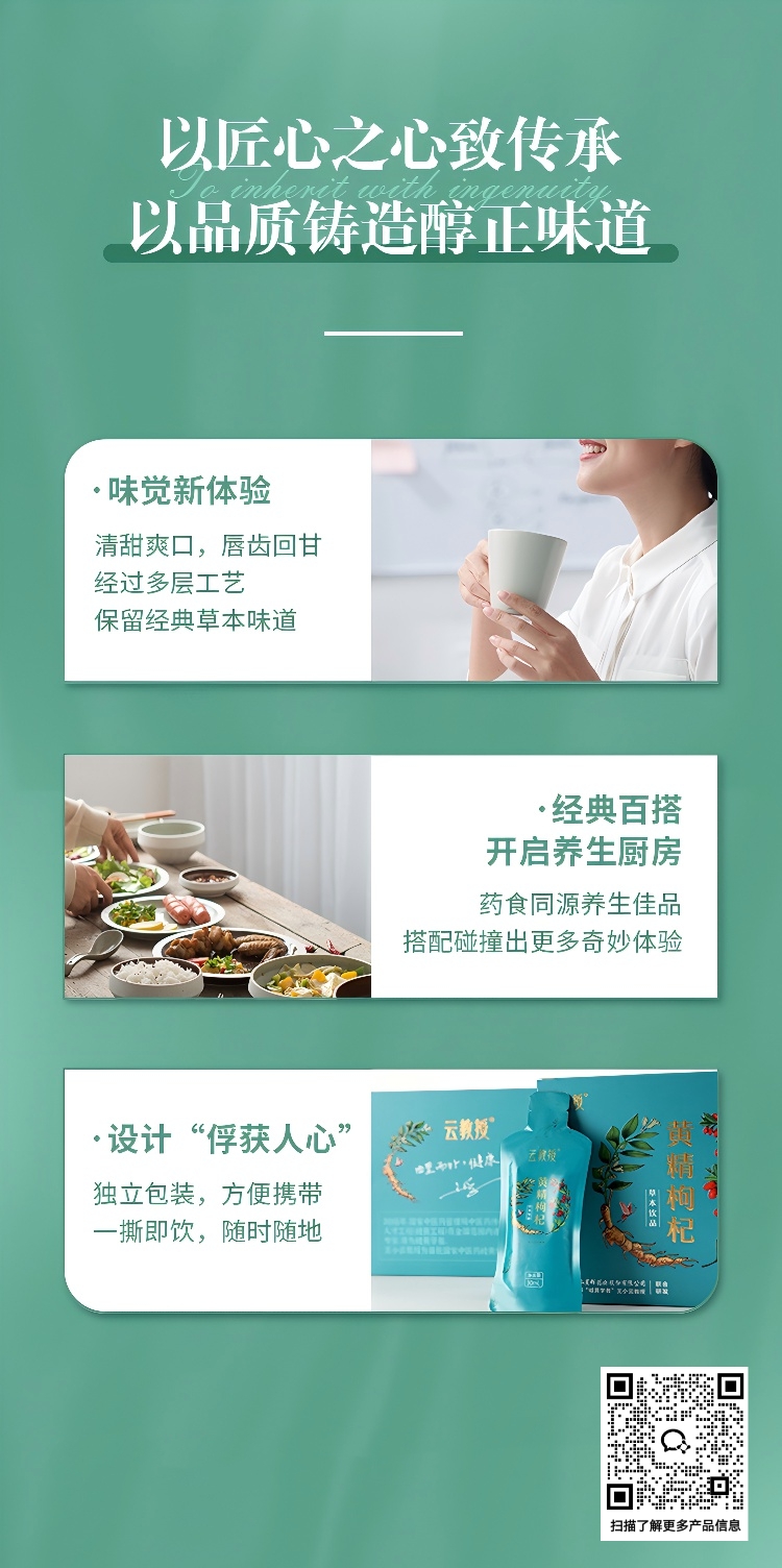 云教授®黄精枸杞草本饮品结合传统养生经方精华,让健康养生变得更简单,让每个人由内而外保持健康、美丽,是云教授品牌的使命。