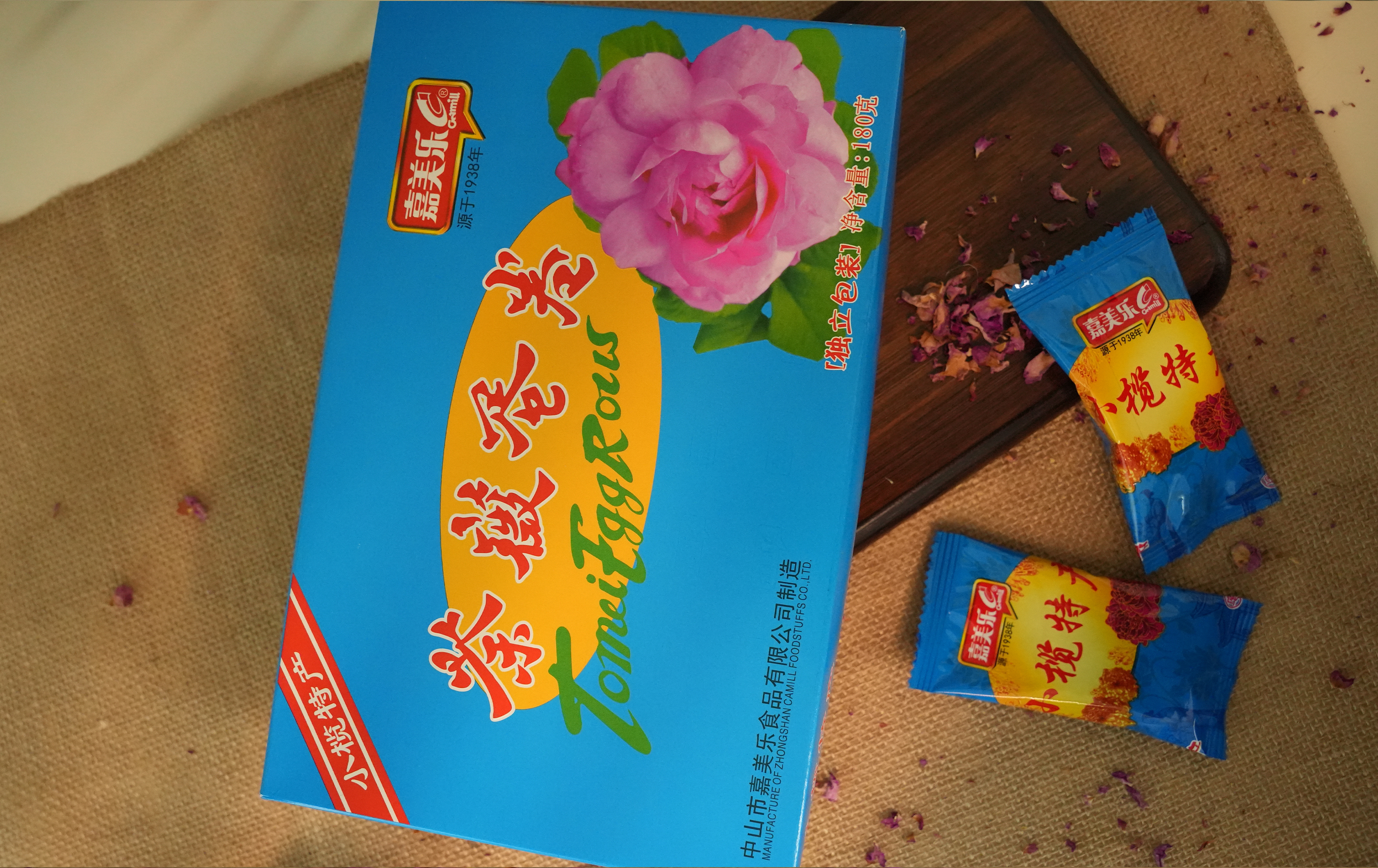 荼薇花,是远古玫瑰花品种之一,在中山已经有三百多年的历史,是菊城的珍稀特产。广东老字号嘉美乐公司将荼薇花融入食品,制作出系列产品:荼薇蛋卷、荼薇花肉、荼薇红豆沙月饼等等,其中荼薇蛋卷曾获得中国名点心荣誉。产品风味独特,花香四溢,令人回味无穷,是馈赠亲友的佳品。