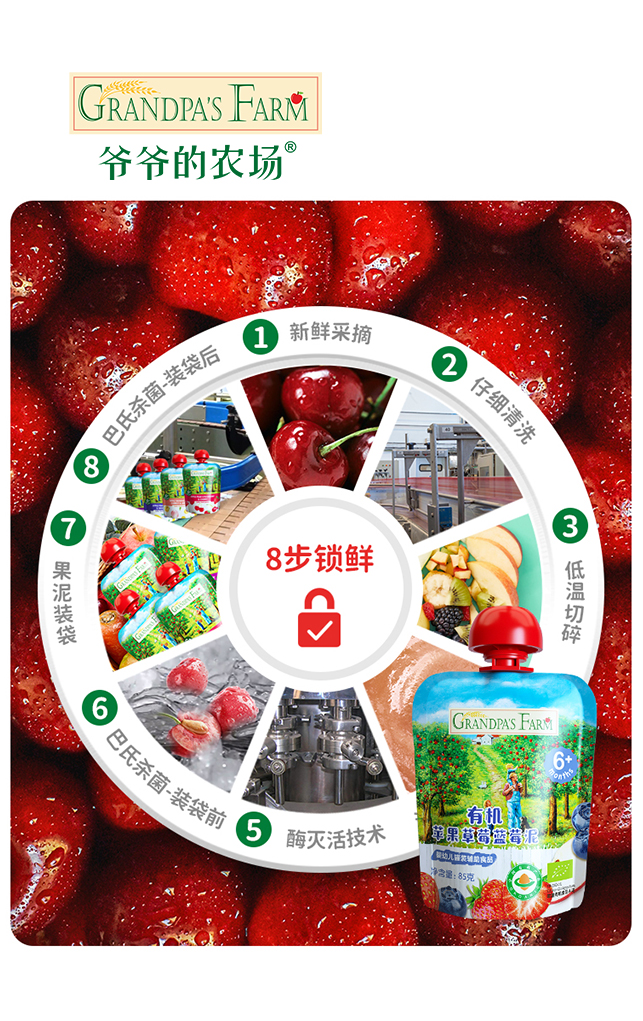 爷爷的农场有机苹果草莓蓝莓泥,法国原装进口,获得中欧双重有机认证,符合婴幼儿辅食标准,品质保障;果泥口感细腻,易吞咽,好吸收,100%鲜果泥,适合婴幼儿食用;产品以苹果、草莓、蓝莓的科学配比,富含抗氧化剂、膳食纤维及多种维生素矿物质,满足其日常膳食营养均衡需求。为6个月以上处于辅食添加阶段的宝宝,提供安全、营养丰富的初期辅食;独立小包装设计方便携带,包装四层锁鲜,果泥不易氧化变质,契合现代家庭外出喂养场景需求。此外,针对健身人士、老年人等特殊群体,突出产品易消化、低热量且能快速补充维生素与能量的优势,精准满足其营养补充与健康养生需求。