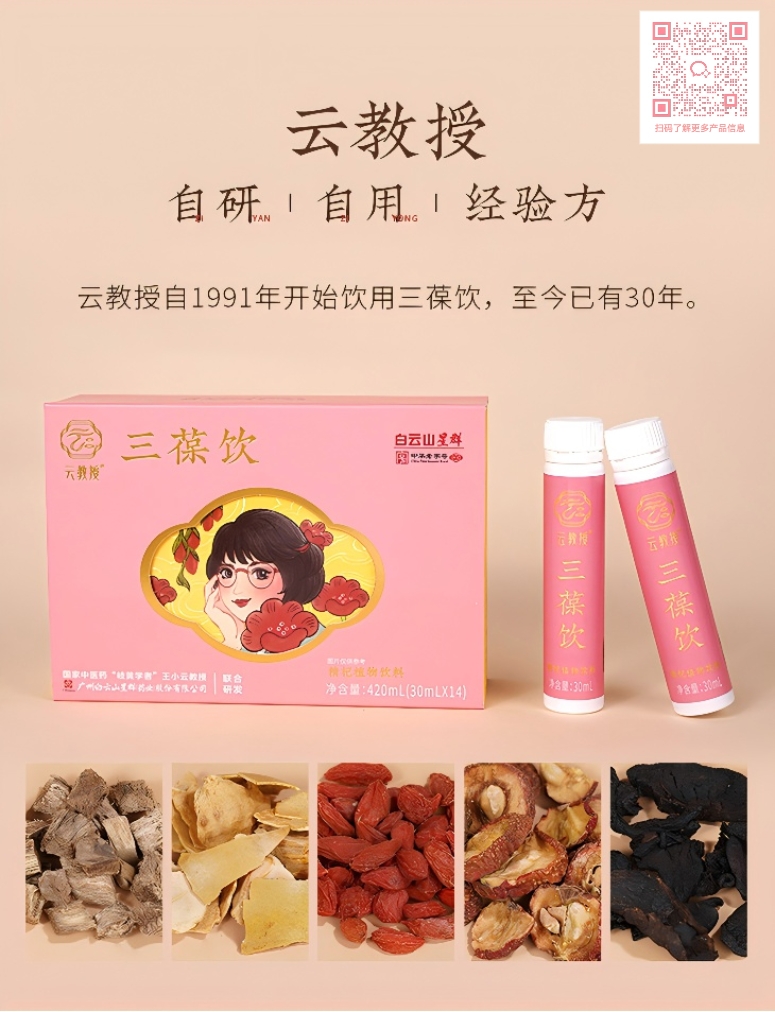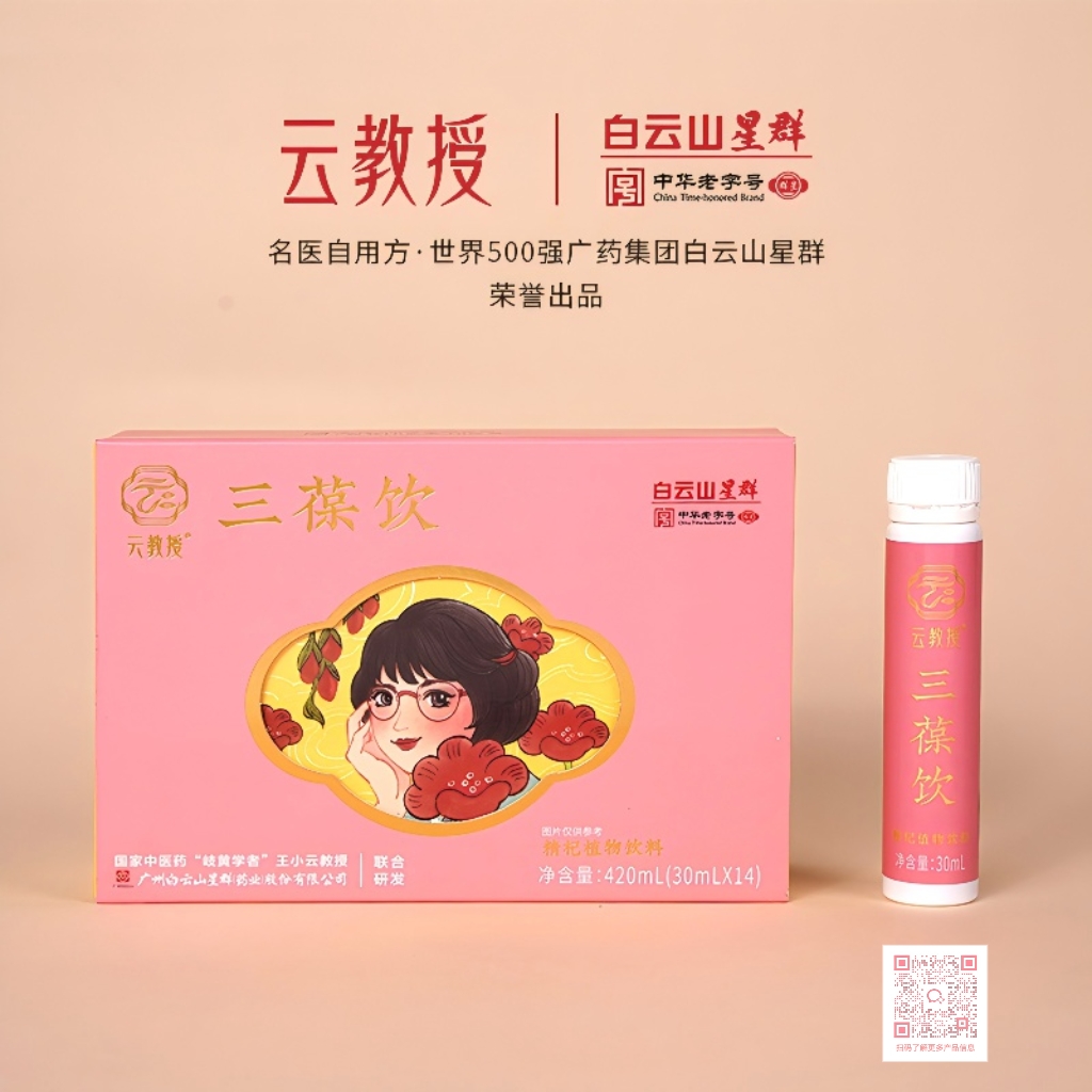云教授®三葆饮精杞植物饮料源于广东省中医院知名妇科中医40余年的自用珍藏名方。经过两年多的反复调整、测试以及百余名志愿者朋友的试用反馈,同时得到了世界500强广药集团白云山星群药业的认可,突破了传统煎煮不便、成分吸收率低的弊端,谨遵制药的工艺,共同研发出适用人群广、服用简便、安全高效的佳品。