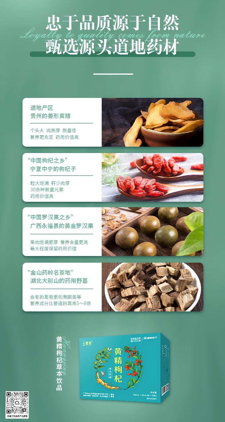 「黄精枸杞」甄选道地药材、地理标志原料,分别选用贵州的多花黄精、宁夏中卫的枸杞子、湖北大别山的葛根、桂林永福的低温脱水罗汉果,100%纯天然萃取,配料表中0蔗糖、0激素、0脂肪、0防腐剂。配方平和,口感芬芳回甘,服用非常方便,直接饮用或温水冲服皆可。